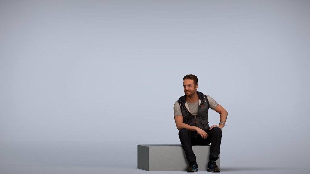 Keywords: 00018_Stephan007, architectural visualization, augmented reality, VR, 3D animation, illustrations, man, sitting, box, on top, relax, resting, container, wooden, surface, holding, thoughtful, outdoor, contemplative, casual