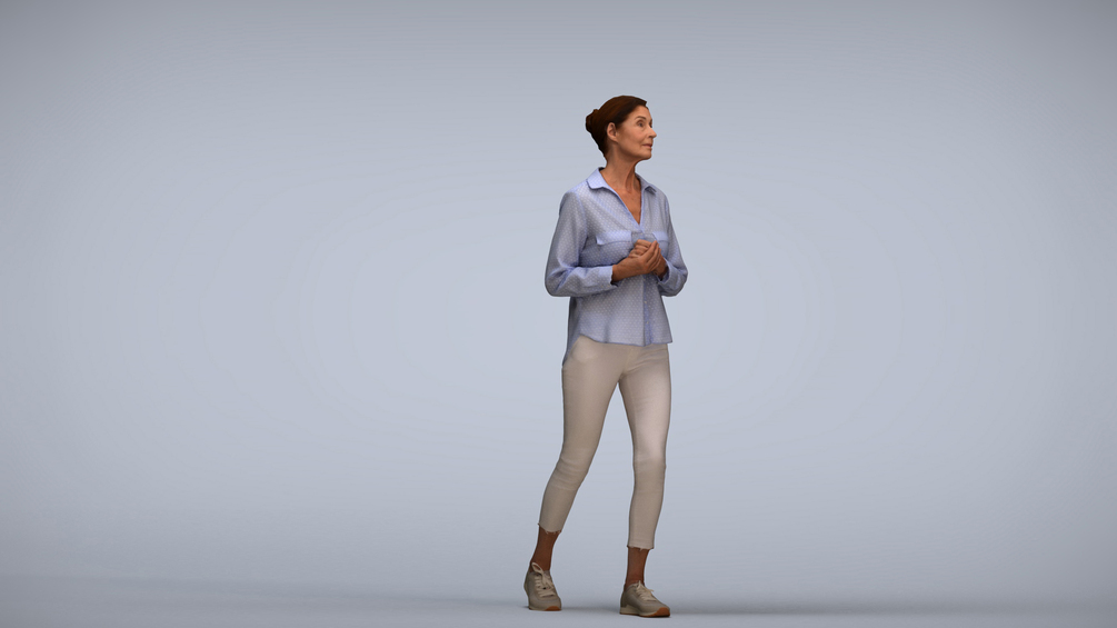 Keywords: 00116_Jenn002, architectural visualization, augmented reality, VR, 3D animation, illustrations, Sure! Here is a list of keywords for the image description you provided:, , Woman, Blue shirt, White pants, Fashion, Casual attire, Style, Clothing, Female model , Indoors, Plain background