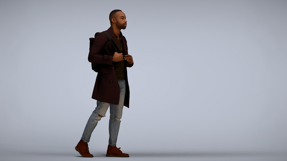 Keywords: 00176_Terrell002, architectural visualization, augmented reality, VR, 3D animation, illustrations, man, walking, jacket, jeans, casual outfit, urban, street fashion, footpath, sidewalk, movement, stride