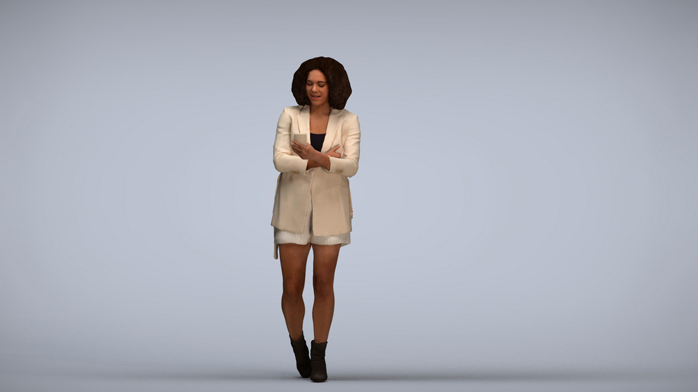 Keywords: 00214_Aimee006, architectural visualization, augmented reality, VR, 3D animation, illustrations, woman, standing, arms crossed, confident, determined, attitude, body language, posture, assertive, strong, independent, using a phone