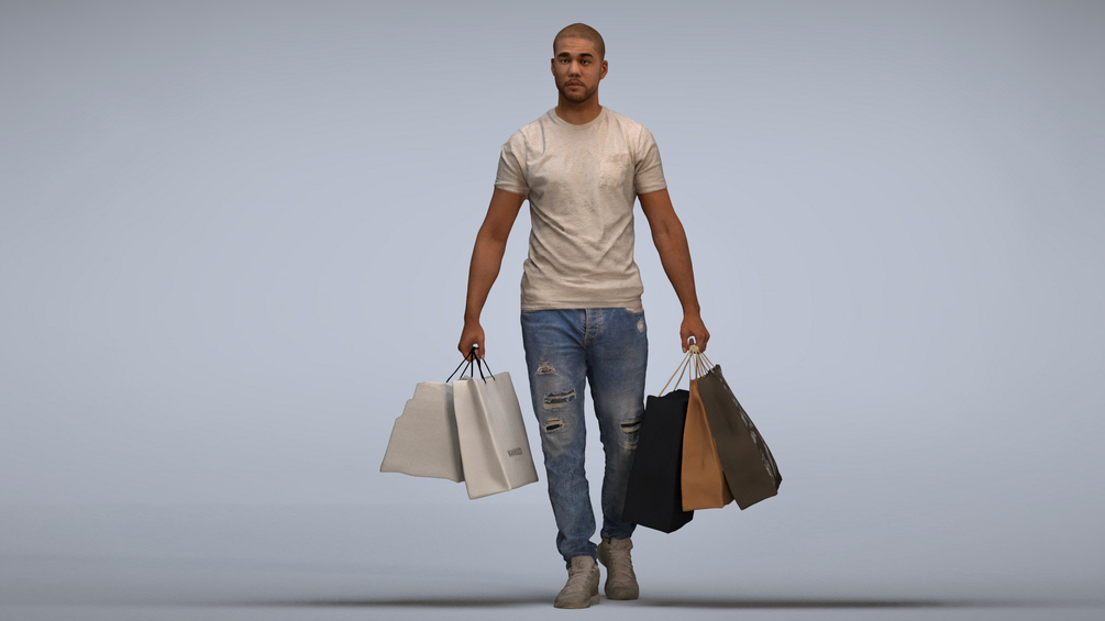 Keywords: 00287_Bill010, architectural visualization, augmented reality, VR, 3D animation, illustrations, man, white tshirt, holding, shopping bags